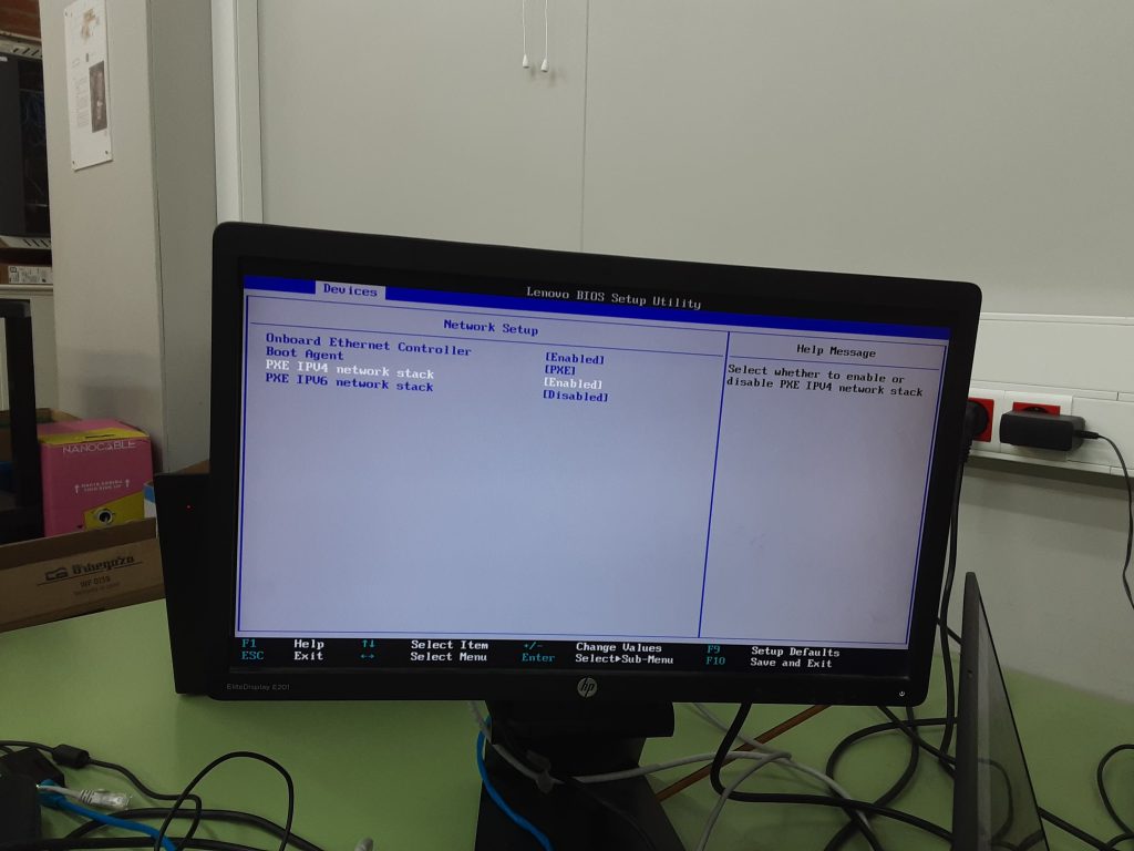 Per habilitar l’arrencada per PXE de la passarel·la entrarem al bios, en el nostre ordinador s’entra polsant F1, però depenent del model pot variar, una vegada dins del bios anirem a: Devices després a Network Setup.